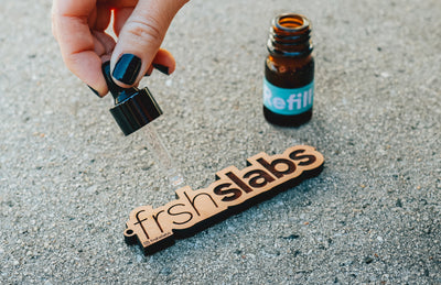 Remove the frshslab from your car, to make sure you don't drip oil in unwanted areas. From here you have two options: either lay it on a flat surface with a napkin underneath, or place it in a plastic bag. Apply 5 - 10 drops on your frshslab, until evenly coated - You can add more or less oil to your liking. Once the wood completely absorbs the oil, or is saturated, you're ready to hang it back in your car.